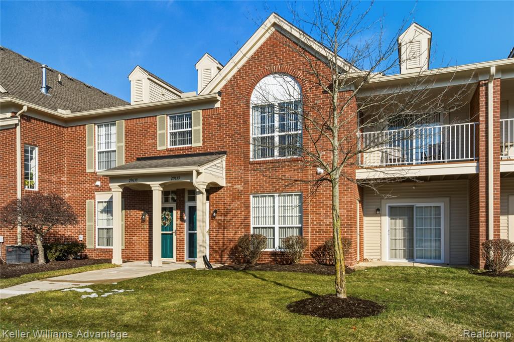 Welcome to Nottingham Village Condo - this is one of the largest layout and a beautiful upper-level unit in this highly desired community. The exceptional second-floor residence offers an open floor plan with vaulted ceilings, creating a bright and airy atmosphere throughout. Private covered balcony with dual entry from the living are and from the primary bedroom. Step into the stunning living room featuring rich engineered hardwood floors, newer carpeting, abundant natural light, and a gorgeous gas fireplace that serves as the perfect focal point. The open-concept dining area seamlessly connects to a spacious kitchen complete with stainless steel appliances - including dishwasher, microwave, electric range/oven, refrigerator/freezer, and garbage disposal - along with ceramic tile flooring, generous counter space, and convenient bar seating for entertaining. This beautiful condo features two oversized bedrooms with ample closet space. The impressive primary suite offers a huge walk-in closet, private en suite bath, and direct access to your own covered balcony - an ideal retreat for morning coffee or evening relaxation. A second full bath, in-unit laundry room with washer and dryer and abundant storage enhance both comfort and functionality. Enjoy the convenience of a private entrance, attached two-car garage, and additional guest parking. Ideally located within the Livonia School District and walking distance to Clarenceville Middle and High School, this well-maintained community is just minutes from shopping, dining, and expressway access. Kitchen, bedroom, laundry and garage entry newly painted. Soft close kitchen and laundry cabinets. This is condo living at its finest. Some furniture are for sale and negotiable.